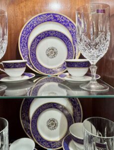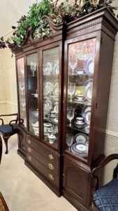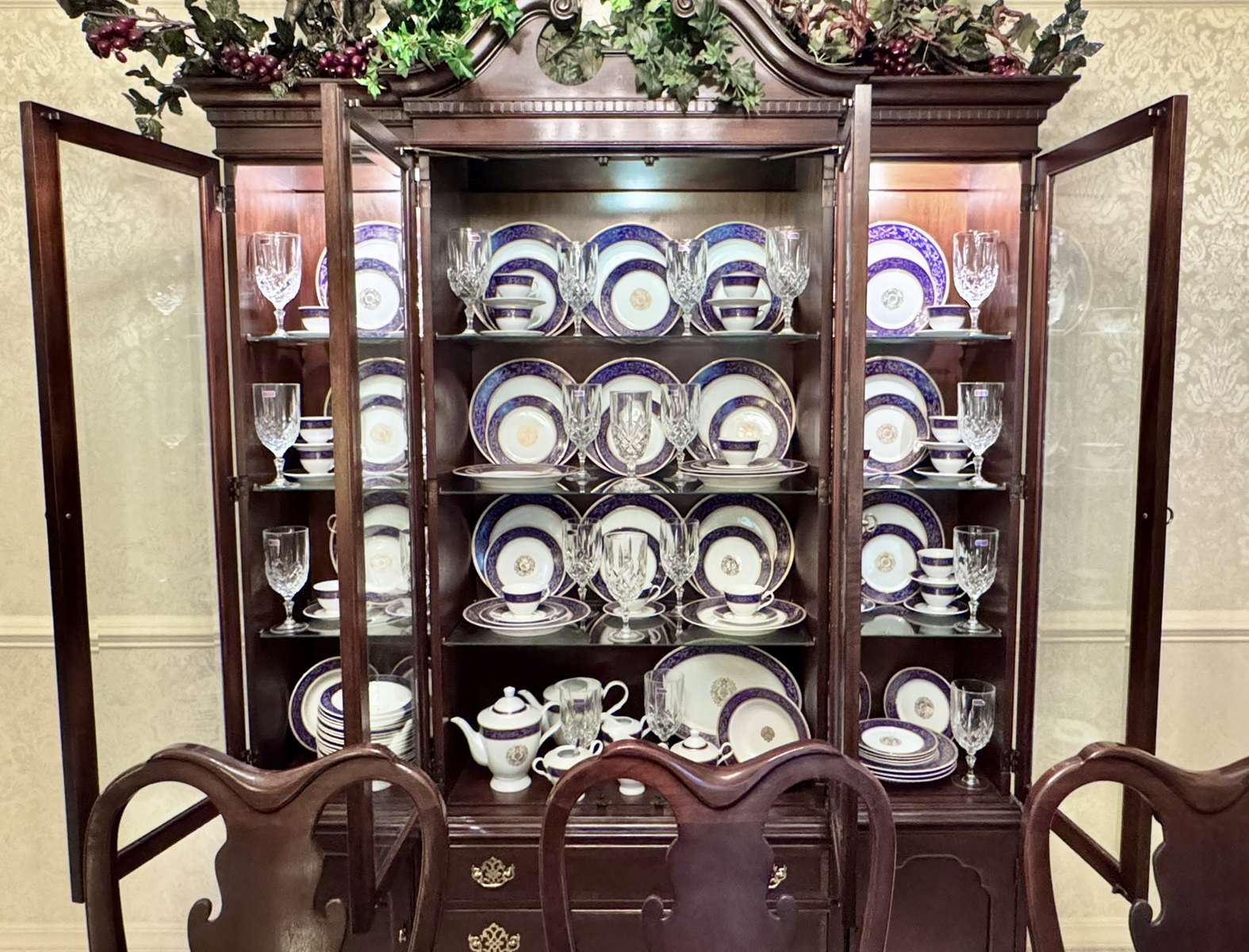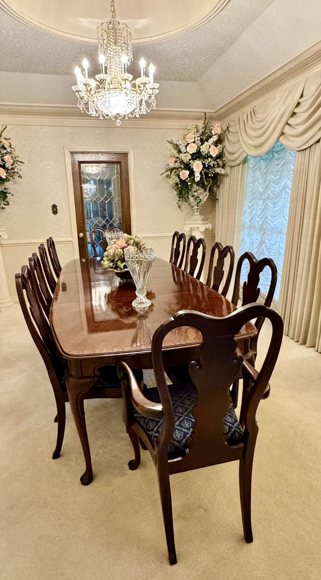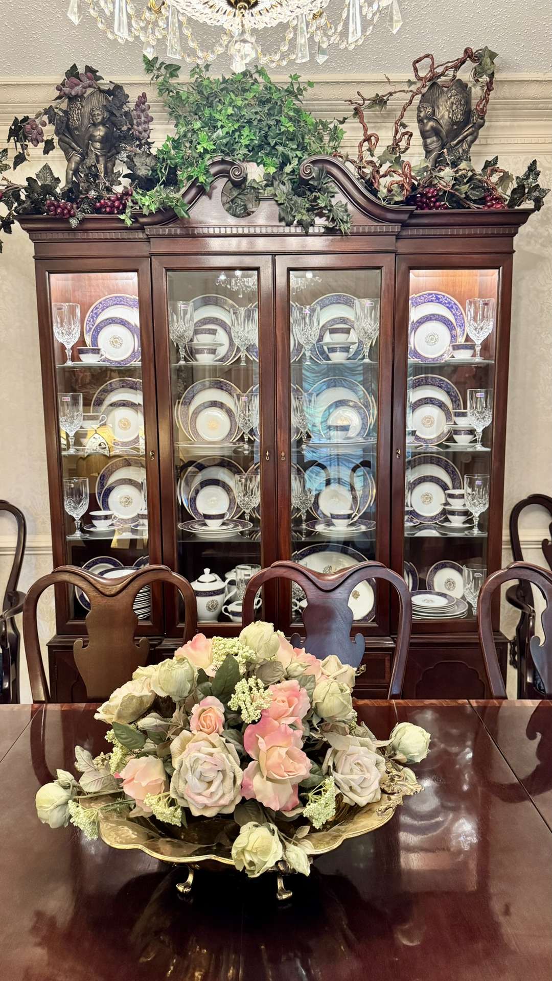 The kitchen is a true cook’s delight, designed for someone who enjoys entertaining—especially during the holidays. The space includes generous stainless-steel cookware, a variety of baking dishes, and beautiful crystal pieces, including select Waterford bowls and elegant stemware. Fine china and the inviting formal dining room provide a perfect setting for holiday meals and special gatherings.