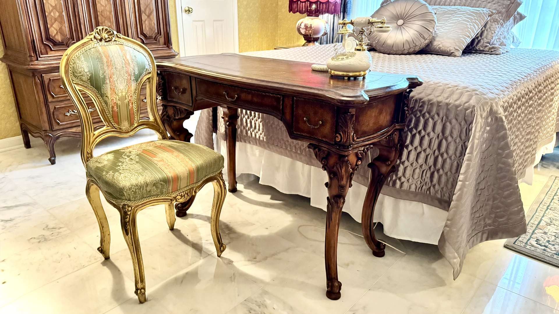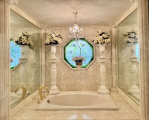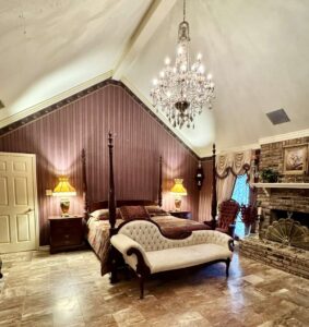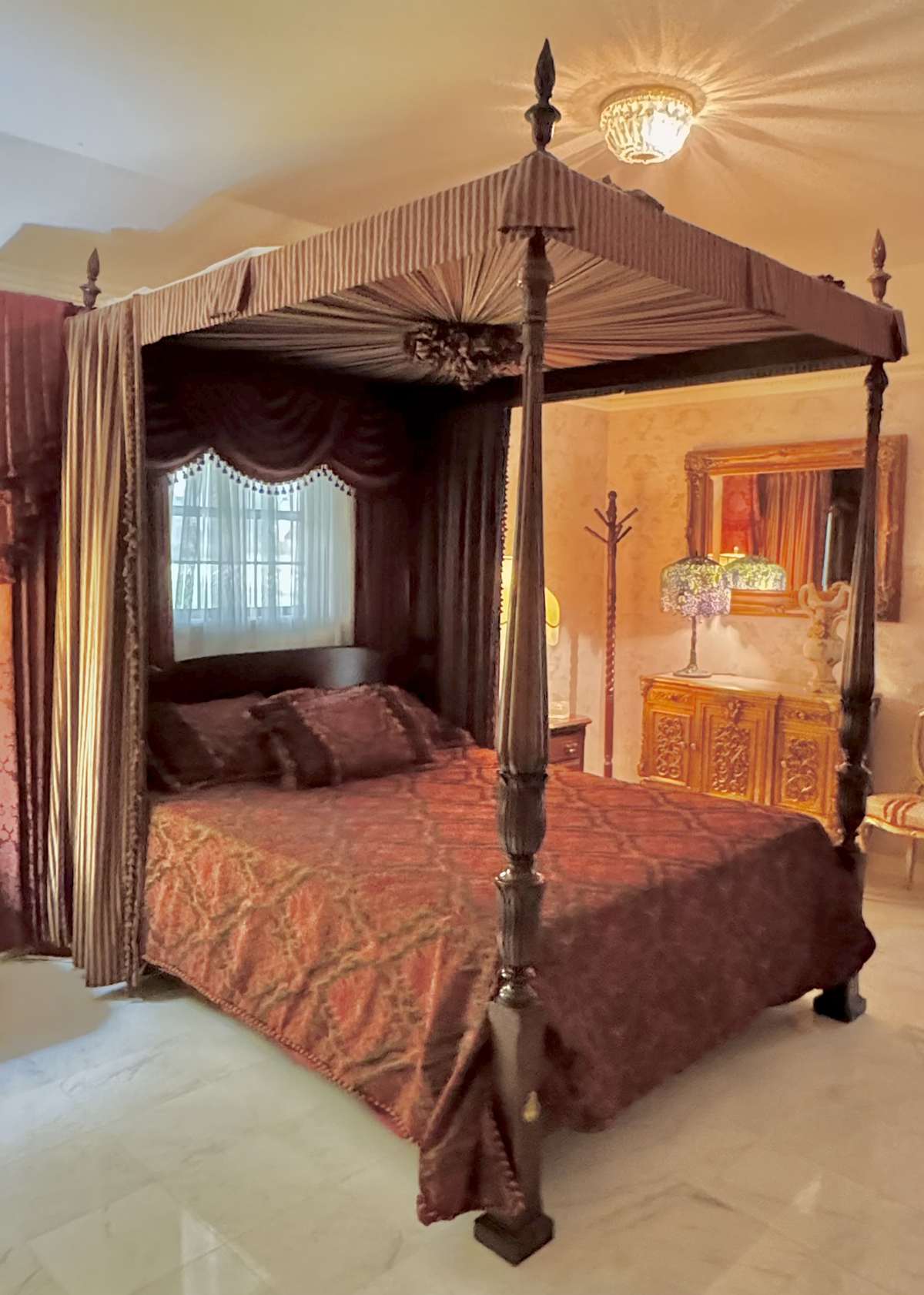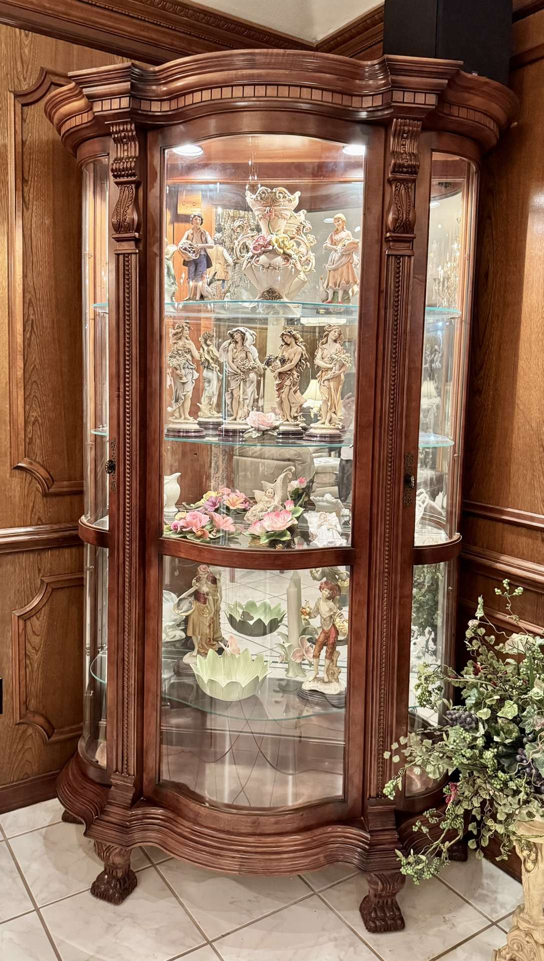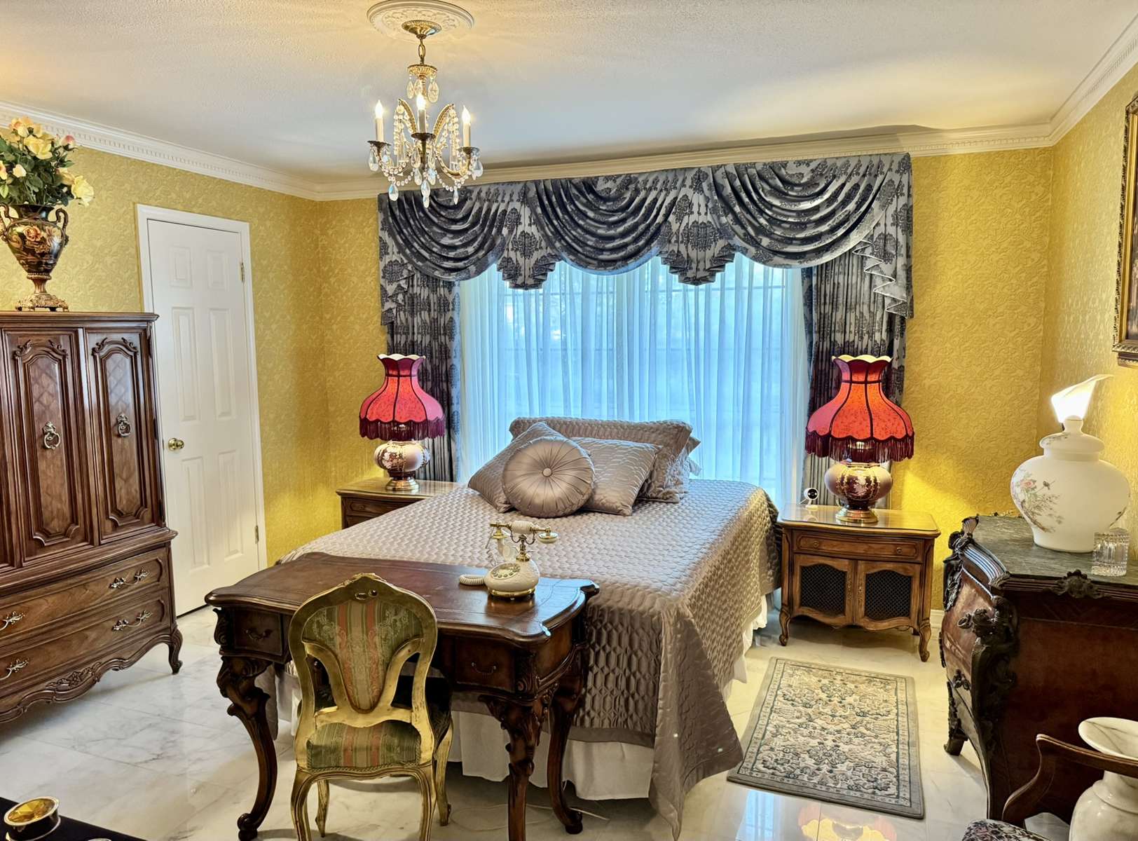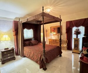 The home also features a noteworthy collection of Giuseppe Armani sculptures from Florence, Italy, thoughtfully arranged and well cared for. The bedrooms continue the home’s calm, cohesive look, including a beautifully dressed canopy bed with coordinated custom linens and décor.