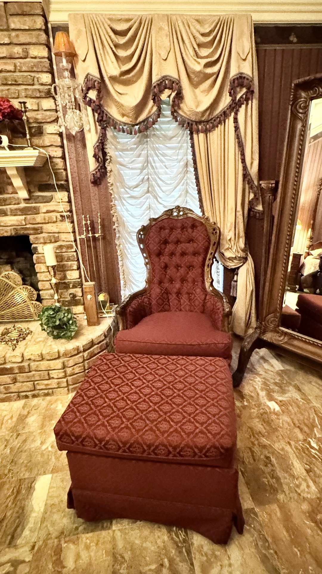 • Burgundy Tufted High-Back Armchairs (2) and ottoman