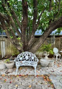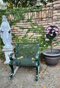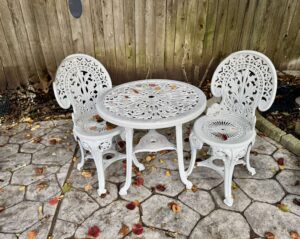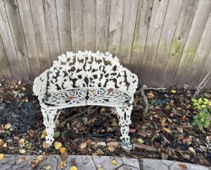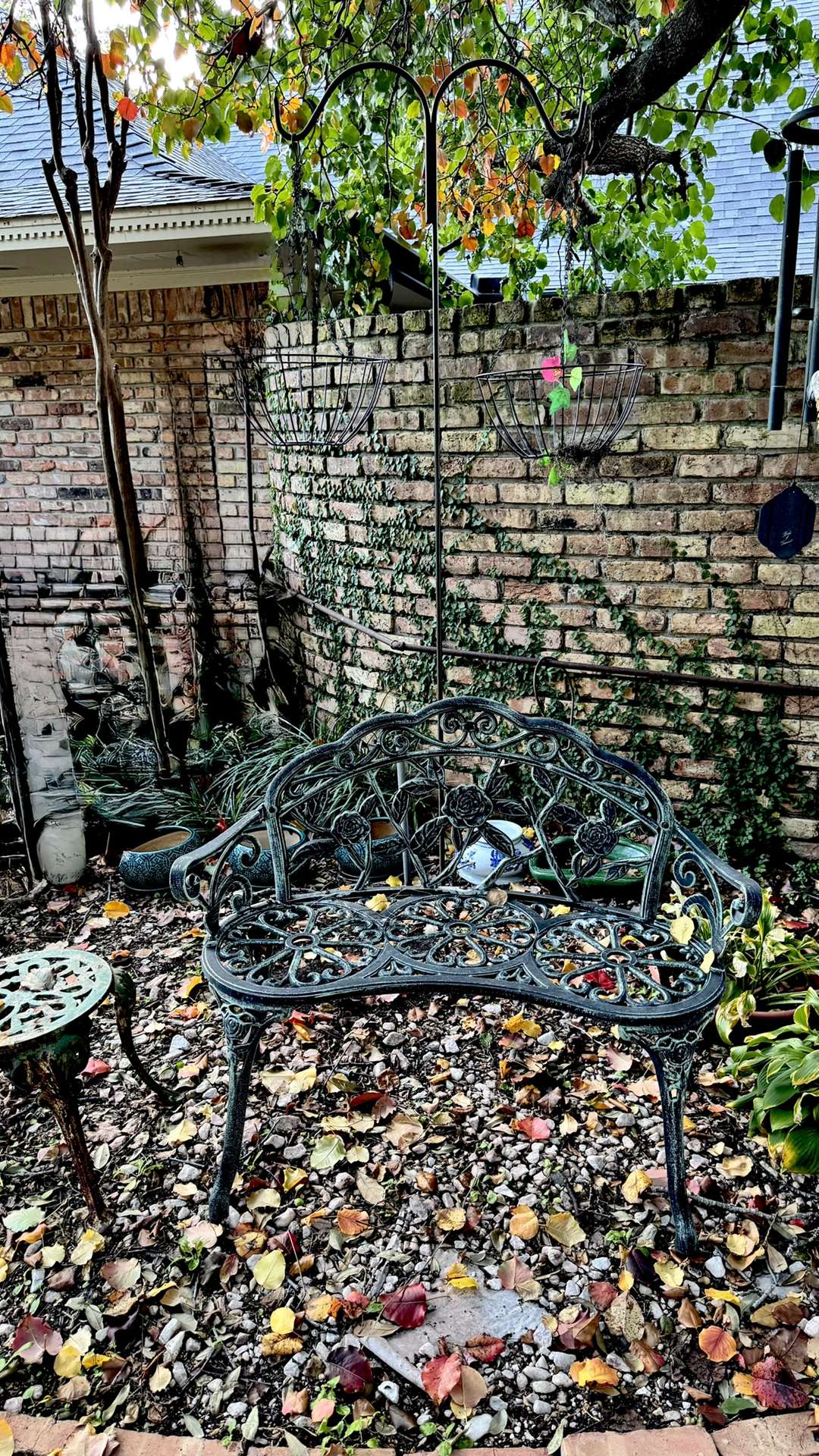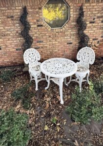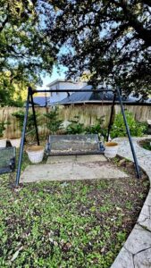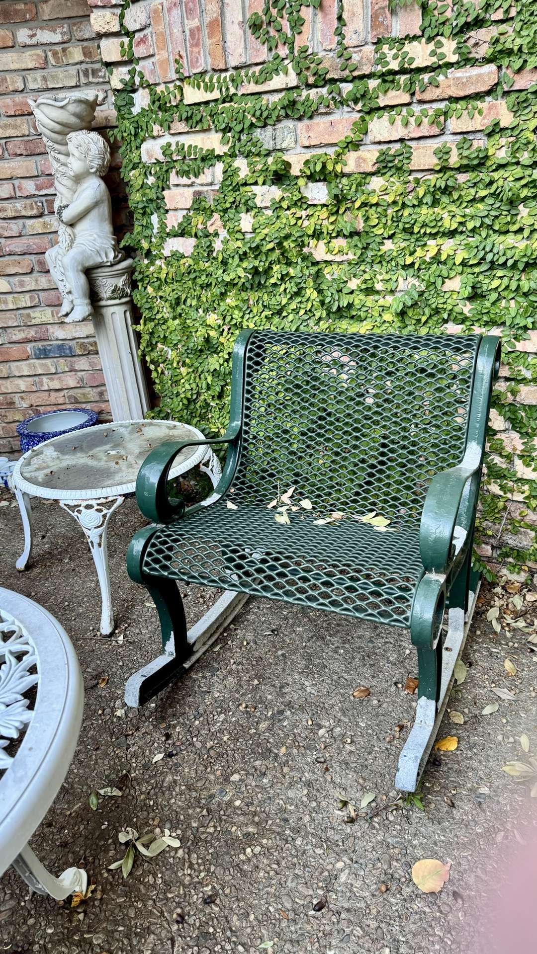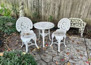 Outdoor seating is placed throughout, with lightweight aluminum garden benches featuring ornate floral backs and several resin bistro sets ideal for morning coffee or an afternoon visit. A sturdy A-frame swing with iron-mesh seating offers a quiet place to sit and enjoy the view.