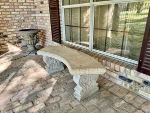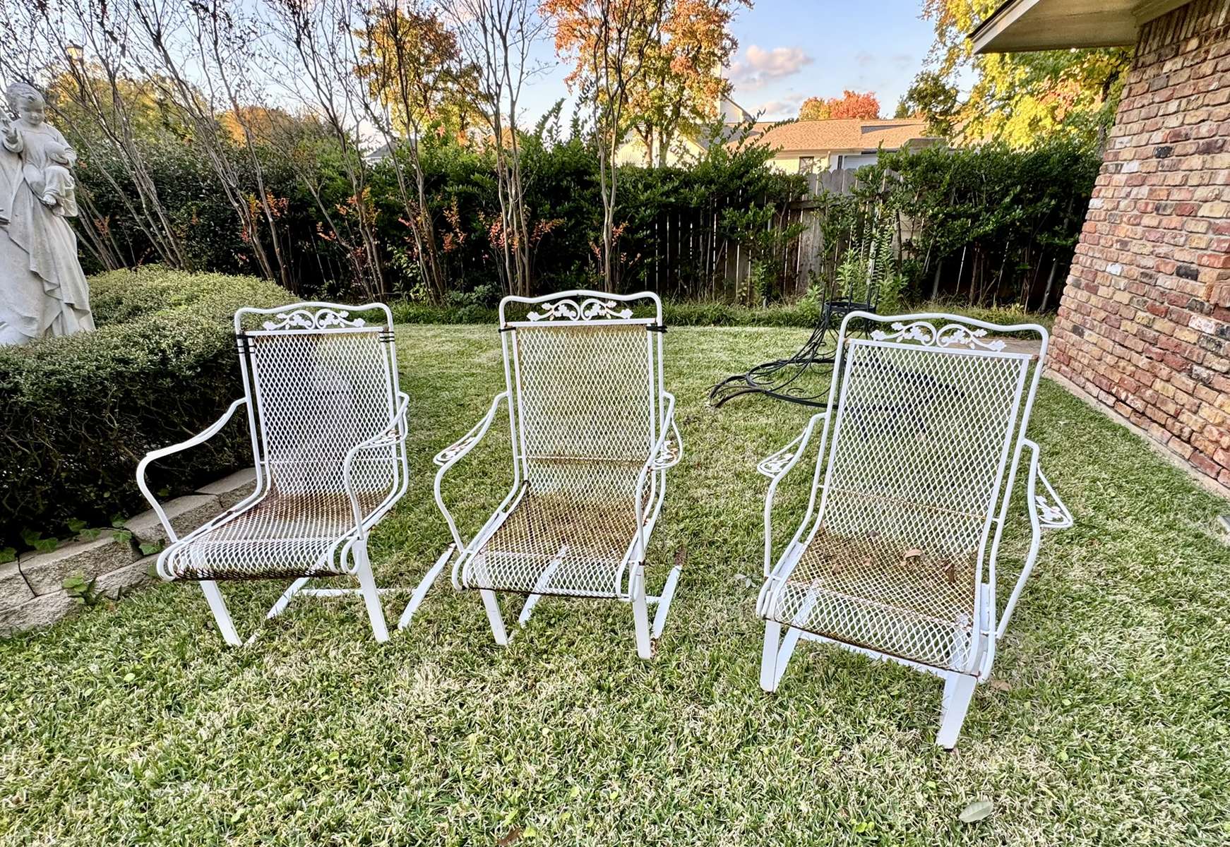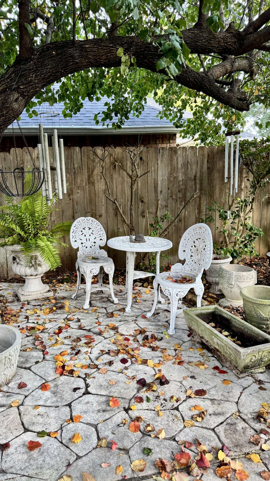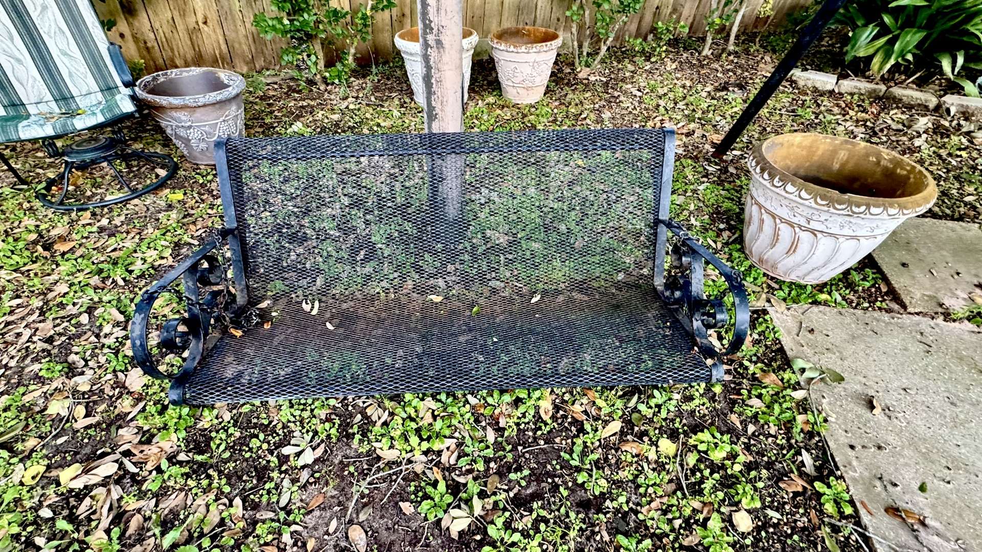 Outdoor seating is placed throughout, with lightweight aluminum garden benches featuring ornate floral backs and several resin bistro sets ideal for morning coffee or an afternoon visit. A sturdy A-frame swing with iron-mesh seating offers a quiet place to sit and enjoy the view.