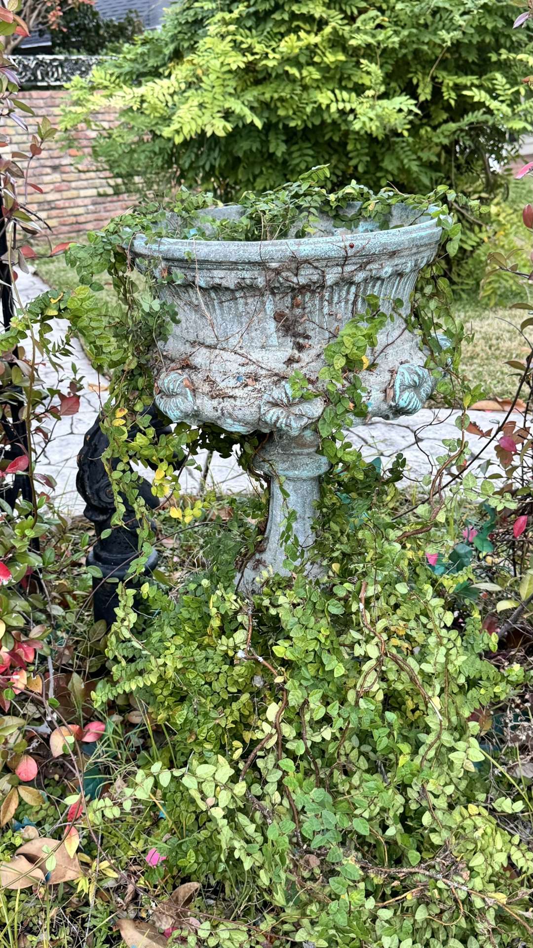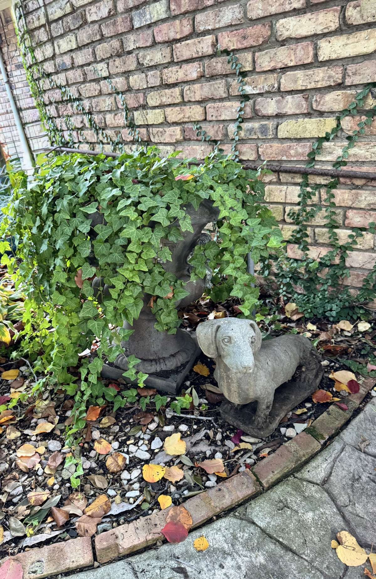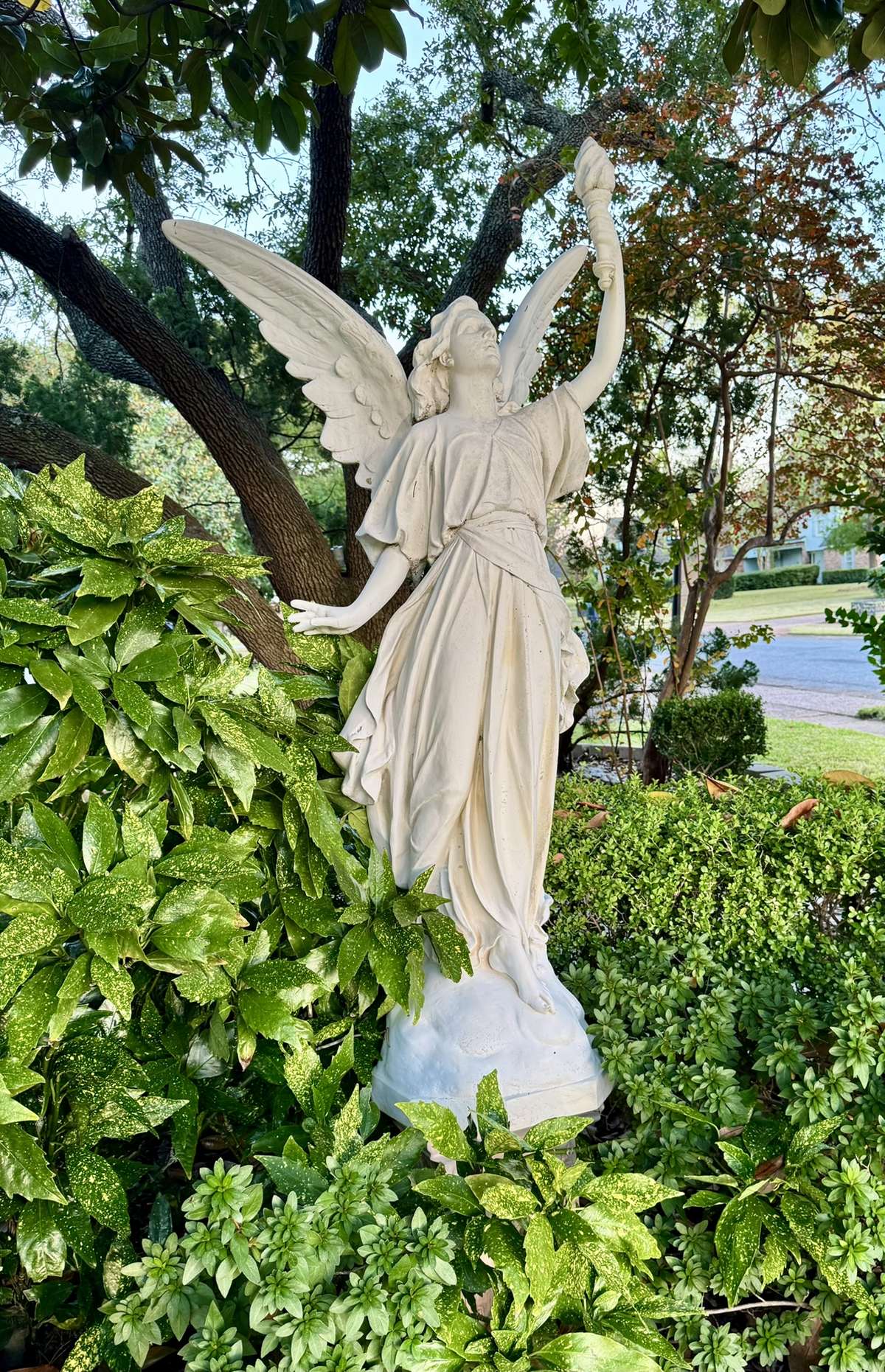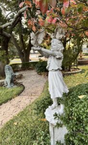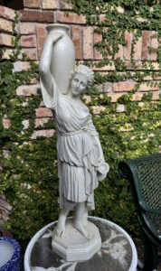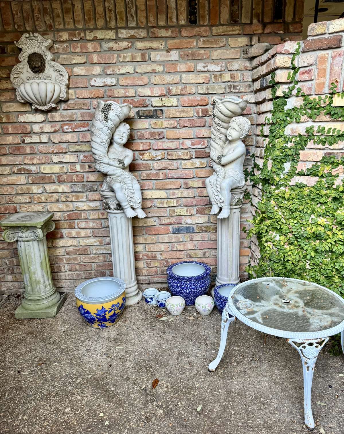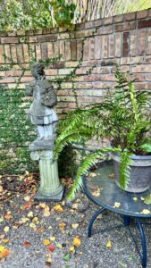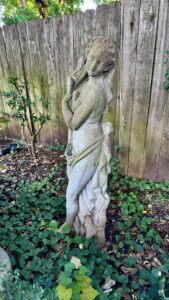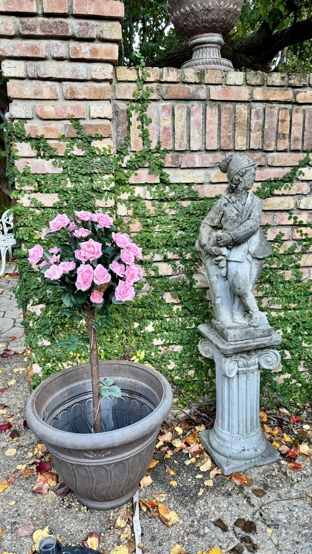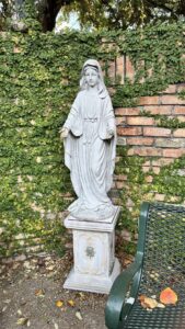 A selection of outdoor statuary brings charm and character, including resin figures of the Madonna, St. Francis, and classical maidens, along with a few almost life-size concrete statues and pedestals that provide height and balance among the planters and greenery.