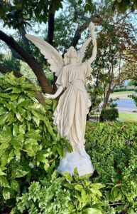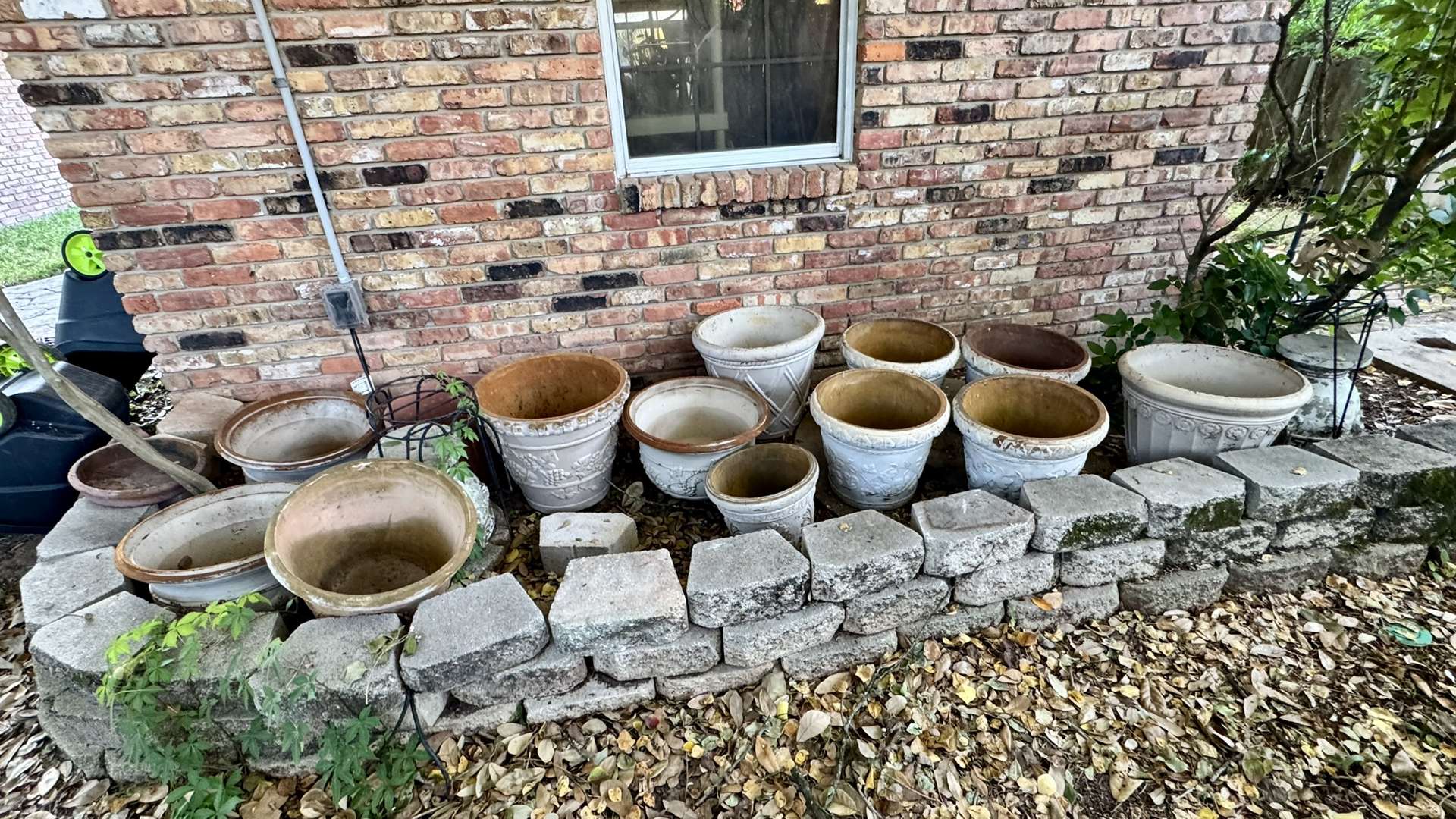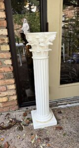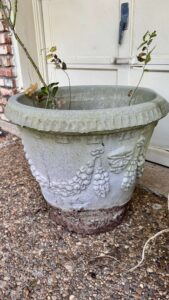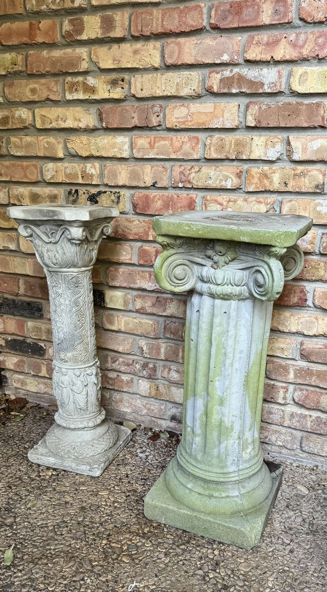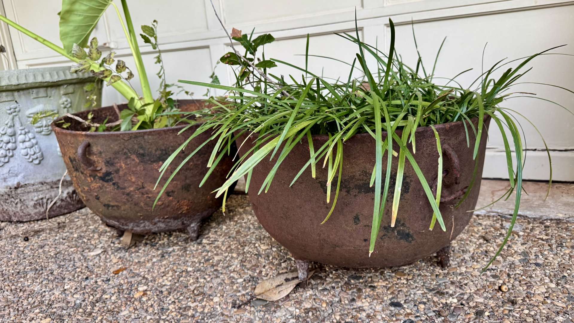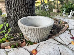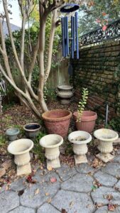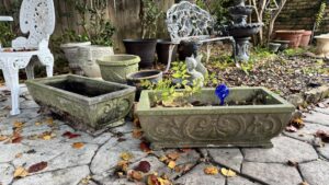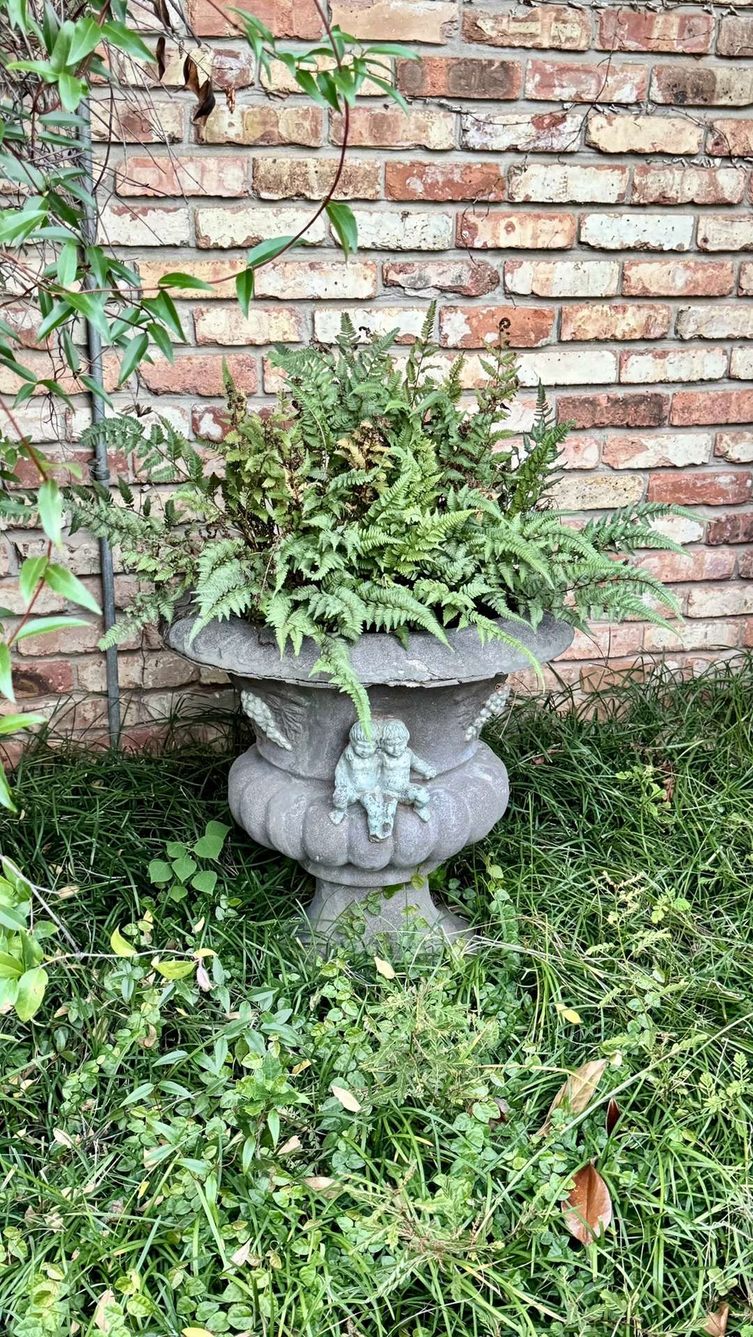 A selection of outdoor statuary brings charm and character, including resin figures of the Madonna, St. Francis, and classical maidens, along with a few almost life-size concrete statues and pedestals that provide height and balance among the planters and greenery.