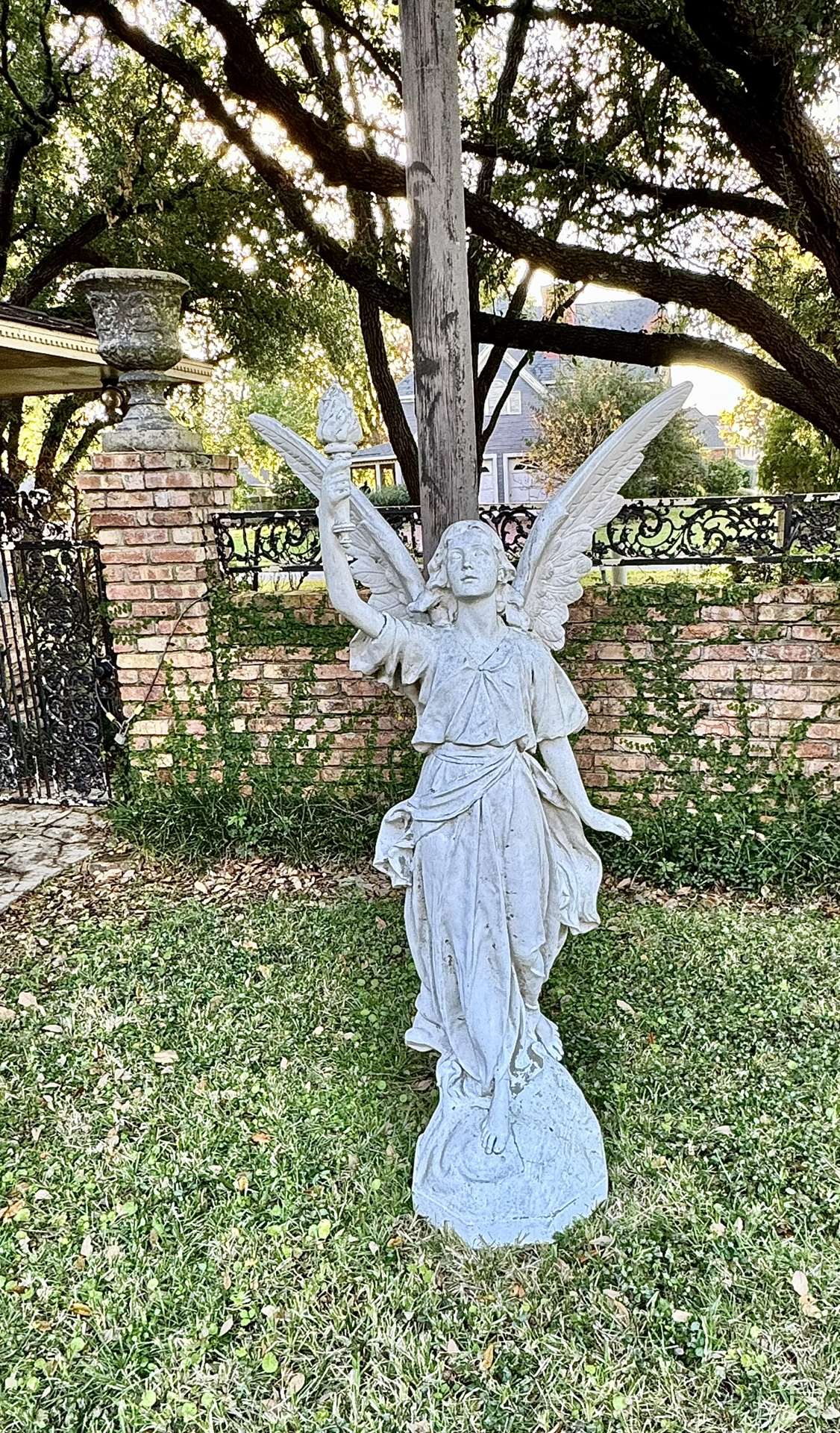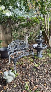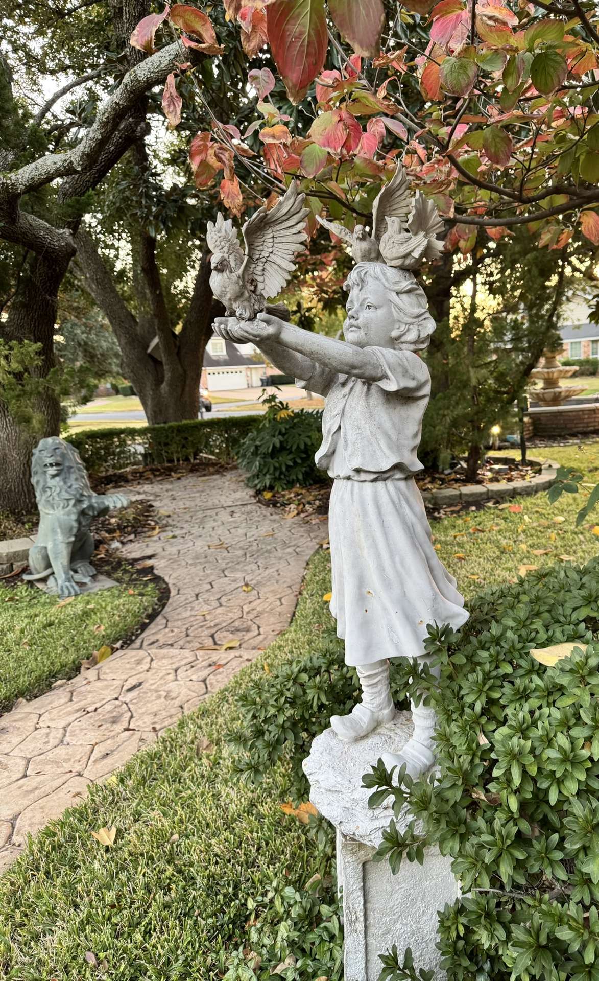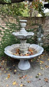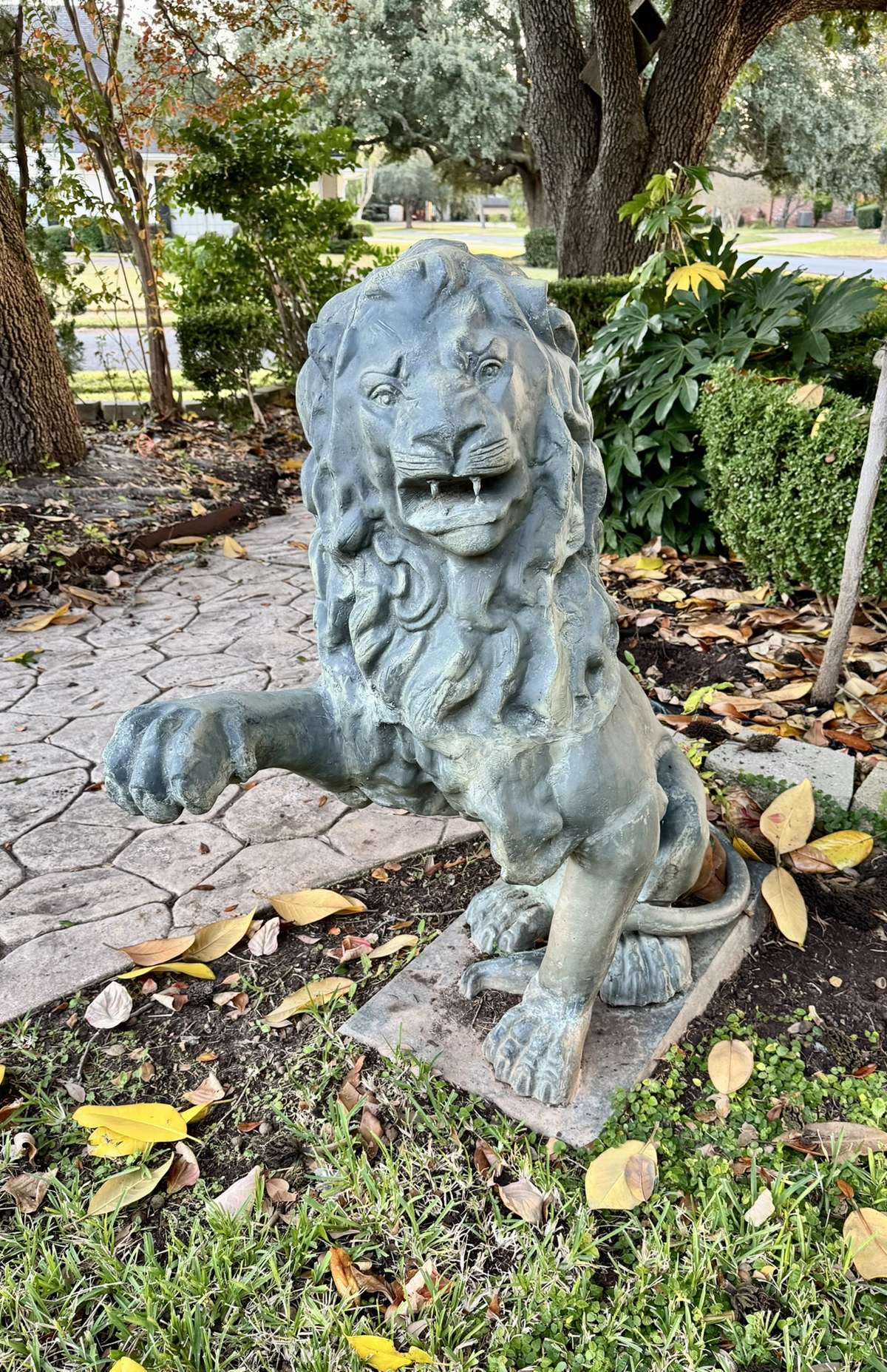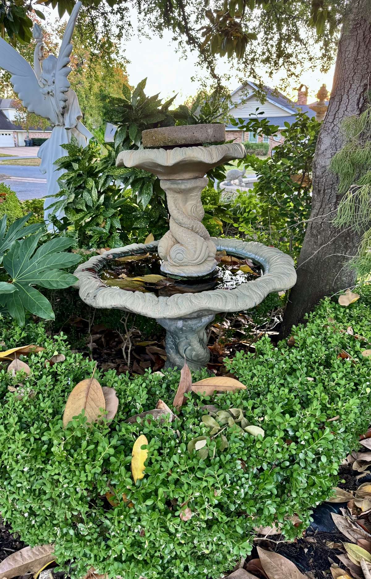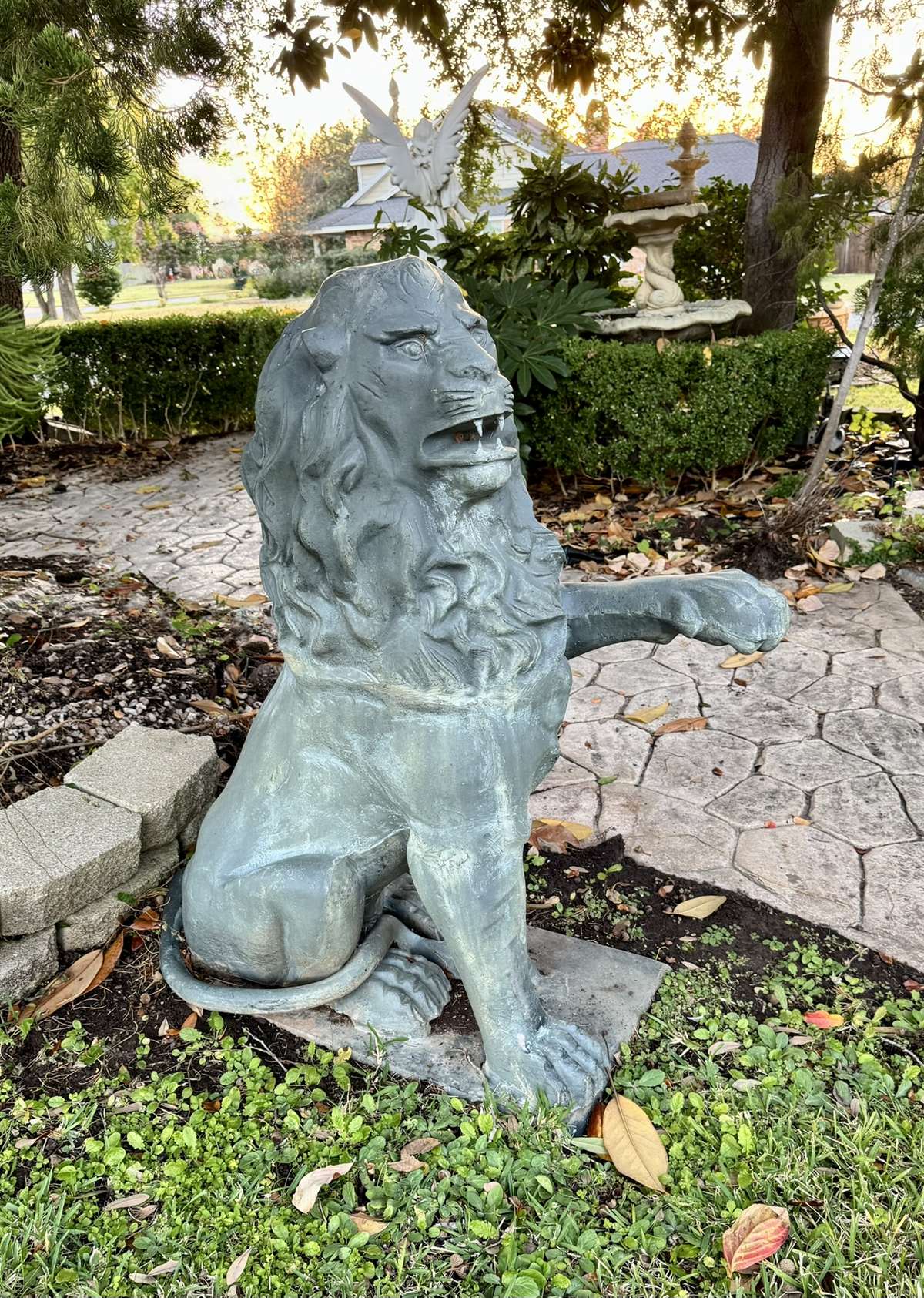 Step into the peaceful meditation garden and the well-kept side and backyard, where tasteful landscaping and thoughtfully arranged garden accents create a relaxing outdoor space. Cast-stone lions and two fountains—a classic multi-tier design with scalloped basins and a smaller aged-stone fountain—add gentle visual interest without overwhelming the setting.